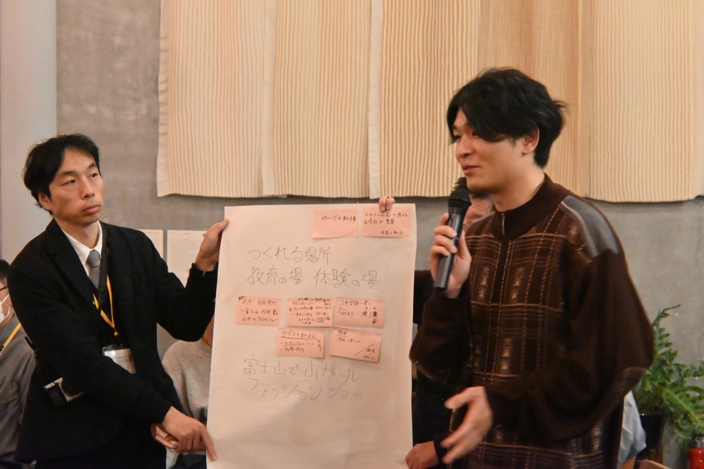 2つのパネルディスカッションを終え、最後に会場で参加した全員でおこなったワークショップでは、自由な発想が次々と飛び出しました。テーマは「こんなことを富士吉田で実現できたらいいんじゃないか」。山梨県デザインディレクターの林千晶による進行の下、4〜5人で構成したチームごとにアイデアを書き出し、配られた模造紙に付箋を貼り付けながら個々の考えをひとつにまとめていきました。参加者それぞれの専門性や得意とする領域から提示された案はどれも現実的で、これからの富士吉田の発展をさらに期待するものばかりです。ここでは全8チームによるプレゼンテーションの様子を振り返ります。