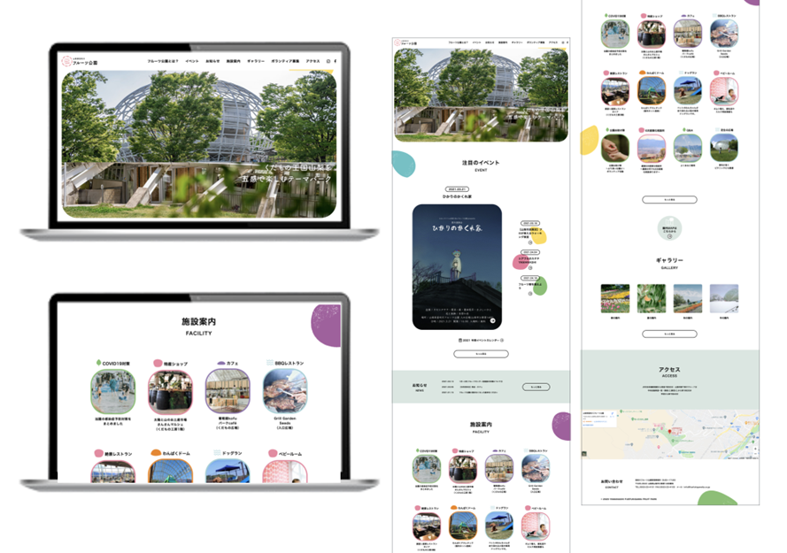 他にも、山梨市の「笛吹川フルーツ公園」では、再ブランディングに際して「五感を楽しむテーマパーク」というコンセプトを提案し、体験型農業やアクティビティ全体を言葉で包み直しました。サイン看板については、フルーツを想起させながら、再ブランディング前から存在する空間の雰囲気を壊さない工夫もしています。