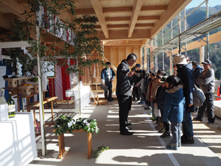 ただ建物を造るだけでなく、建設過程から地域を巻き込みました。地域唯⼀の⼩学校の全校⽣徒28⼈を招いて上棟式を⾏い、最後には餅まきもしました。