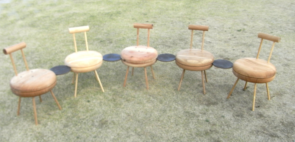 家具デザインでは、⼭梨県が70%森林に囲まれ林業が盛んなため、林業と持続可能な森づくりをテーマに活動しています。甲州市からの依頼で、甲州市の⼭にある材料を使って椅⼦をデザインしたり、スーパーの(株)オギノが所有する森から出た端材を使って家具を作ったり、リサイクルしたワイン樽を利⽤してベンチを作ったりもしています。