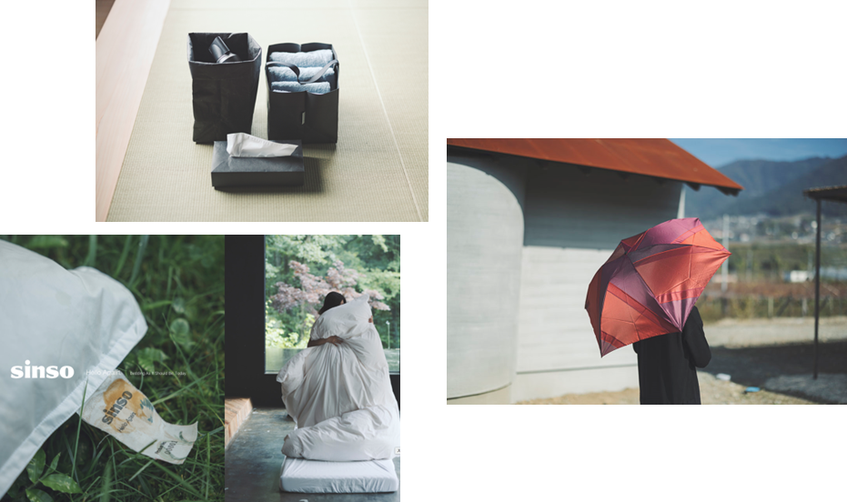 「FUDO」は単なる宿泊施設ではなく、⼭梨の地場産業を案内し、体感してもらうことをコンセプトにしています。市川三郷町の和紙⼯房「⼤直」を案内したり、富士吉田の槙田商店さんの傘を宿泊者に無料でレンタルしたりしています。⼭梨には⾯⽩い布団屋さんもあり、「sinso」の布団をFUDOでは使っています。ぶどう畑に囲まれた勝沼で、⼭梨の⾵⼟を体感できる⼩さな⾐⾷住複合施設として「暮らすように泊まる」をコンセプトにしています。