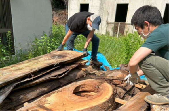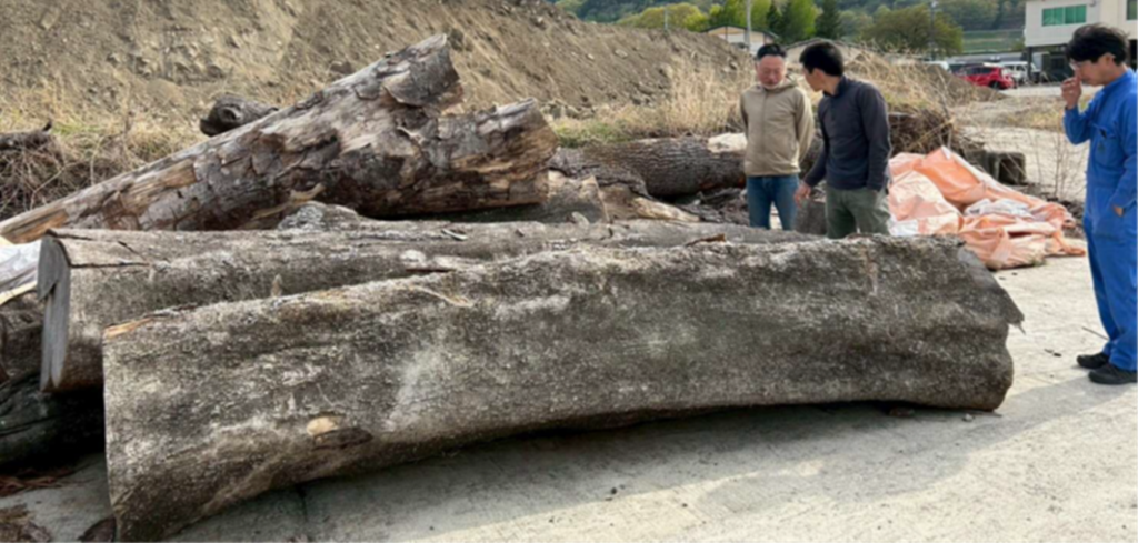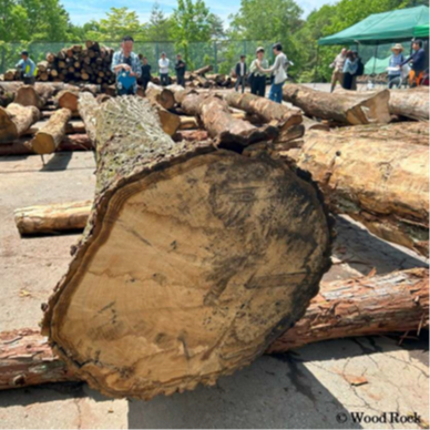 或いは、庭木です。山梨は別荘地が多いこともあり、特殊伐採が多いです。木が伸びて道路に出たから伐ってほしいなど(支障木等を伐る)となったときに、それをただ伐って燃やす、薪にするのではなく、特に大径木は板材にして救うことができます。それら広葉樹を救うという意味で、ウッドロックでは「レスキューウッド活動」も始めています。